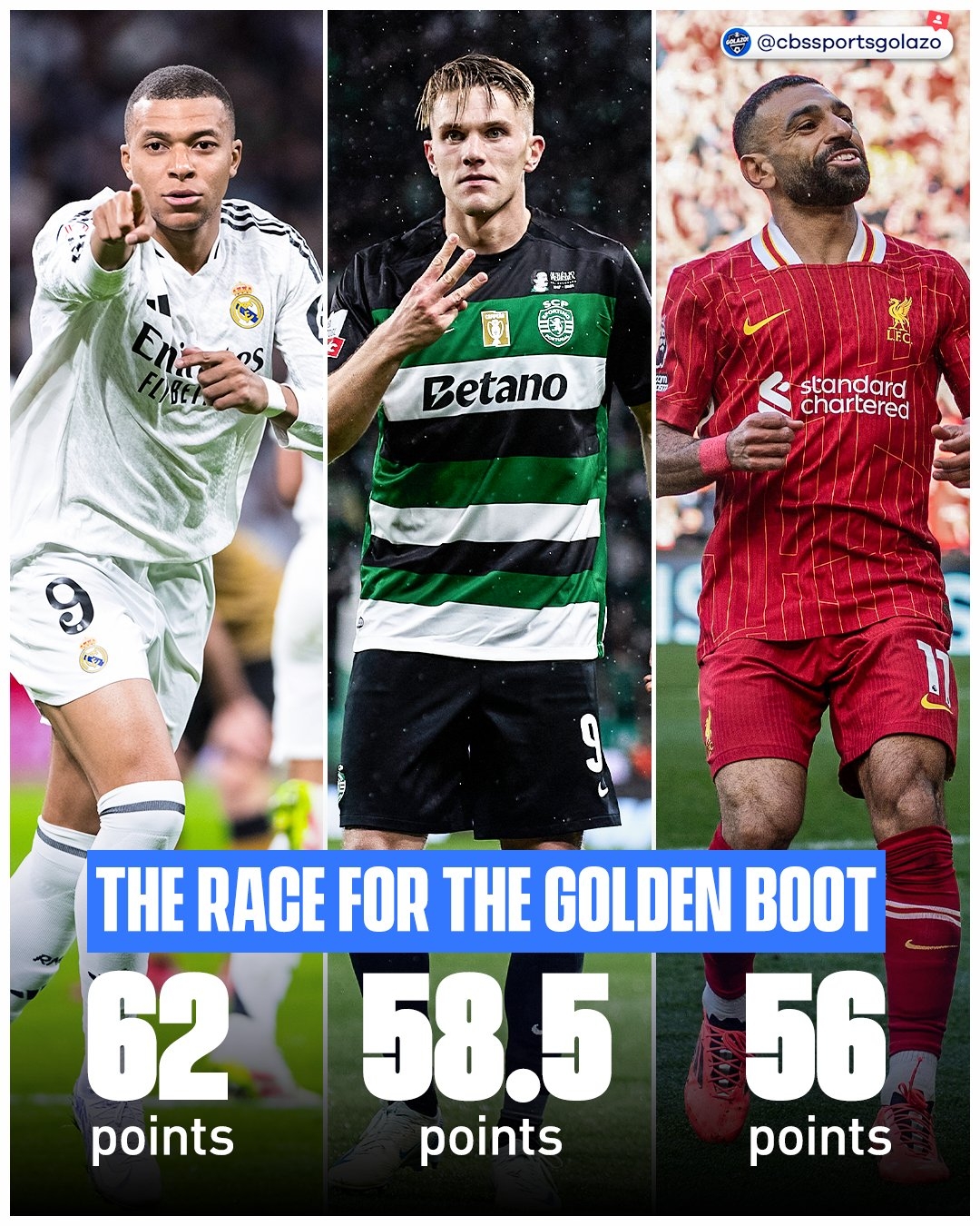 24/25赛季即将结束,姆巴佩本赛季西甲打入31球,以62分领跑欧洲金靴争夺,萨拉赫需在英超末轮上演大四喜才能反超。